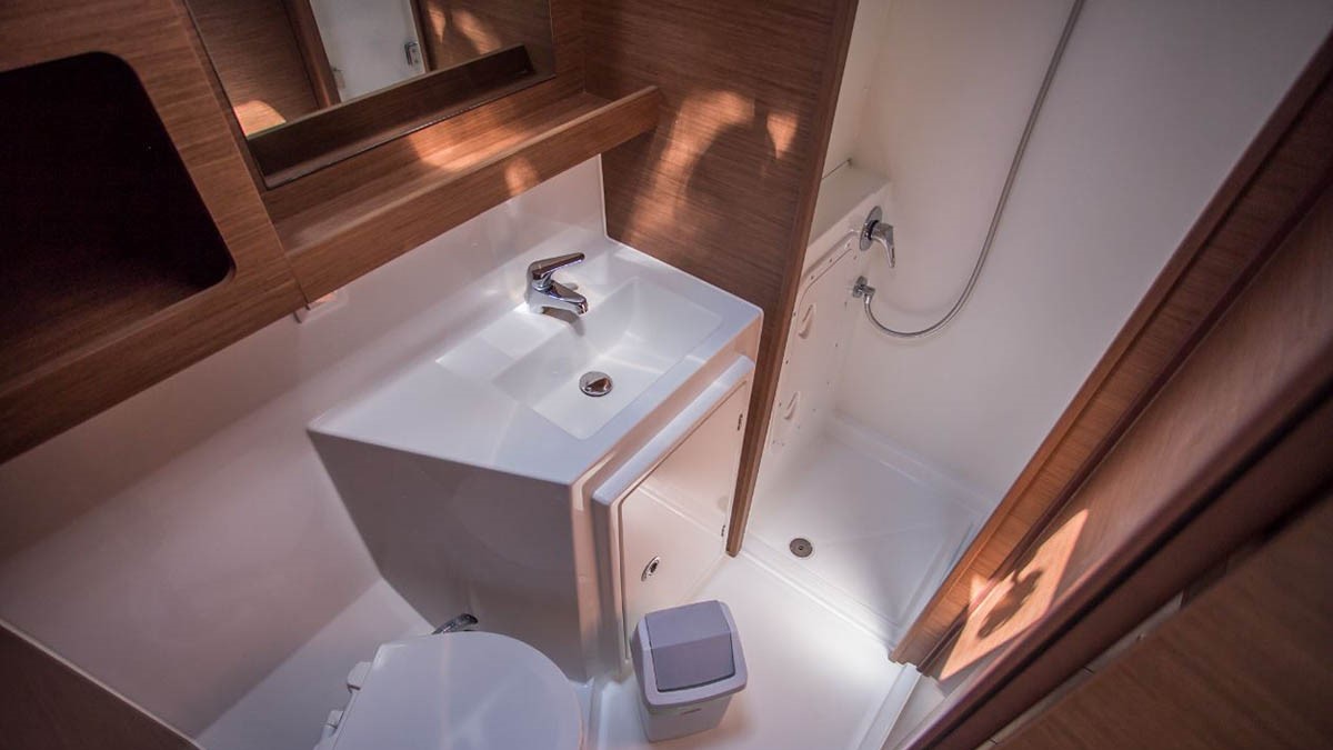 W kojach rufowych są normalne kabiny prysznicowe - WC – podobnie jak z prysznicem, jeśli jest dostępna ” prawdziwa” korzystamy z niej, jeśli nie korzystamy z jachtowej – do WC na jachcie nie wrzucamy papieru NIGDY – papier toaletowy zawsze trafia do kosza